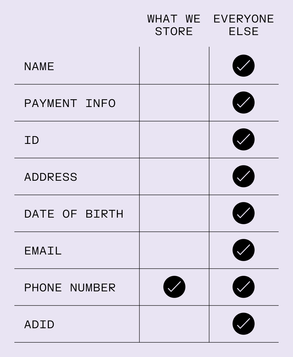 We only collect the minimum amount of data needed to provide you service.