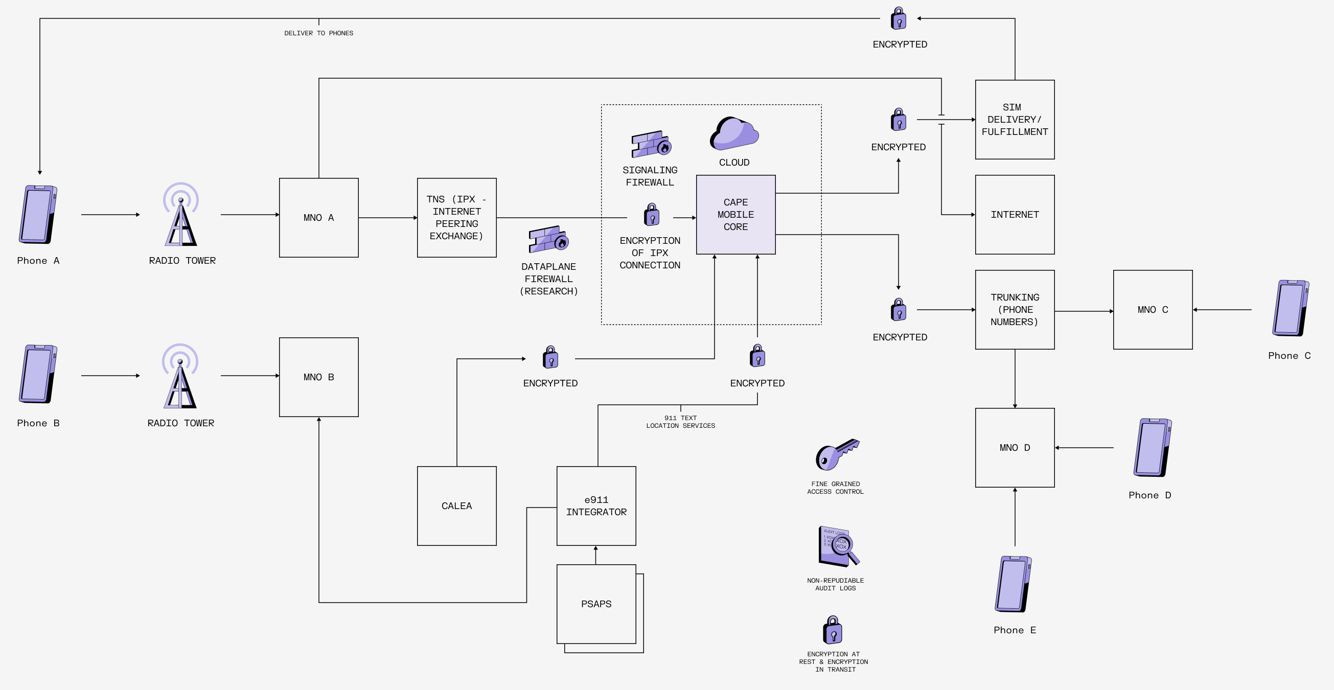 Many small carriers rely on trusted third-party (TTP) providers for lawful interception compliance, giving outsiders access to their core networks. While we rely on trusted third-party providers for specialized systems like emergency service routing and payment tokenization, these integrations are designed to prevent sensitive data from ever passing through or being retained by Cape. In contrast, for lawful interception (CALEA), we chose to own and manage the infrastructure in-house. This decision minimizes third-party exposure to user communications, reflecting our commitment to protecting the most sensitive aspects of your privacy.